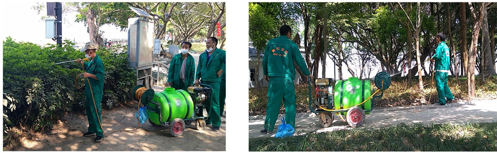 對大型噴霧車不方便進(jìn)入的蚊子聚集的密集區(qū)域采用手推式動力噴霧機,機動能力強,載藥量大,噴射強度大,持續(xù)有效的消滅這些區(qū)域的蚊蟲。
