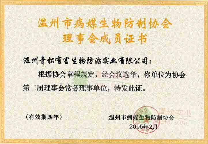 溫州市病媒生物防治協(xié)會(huì)理事會(huì)成員證書(shū)