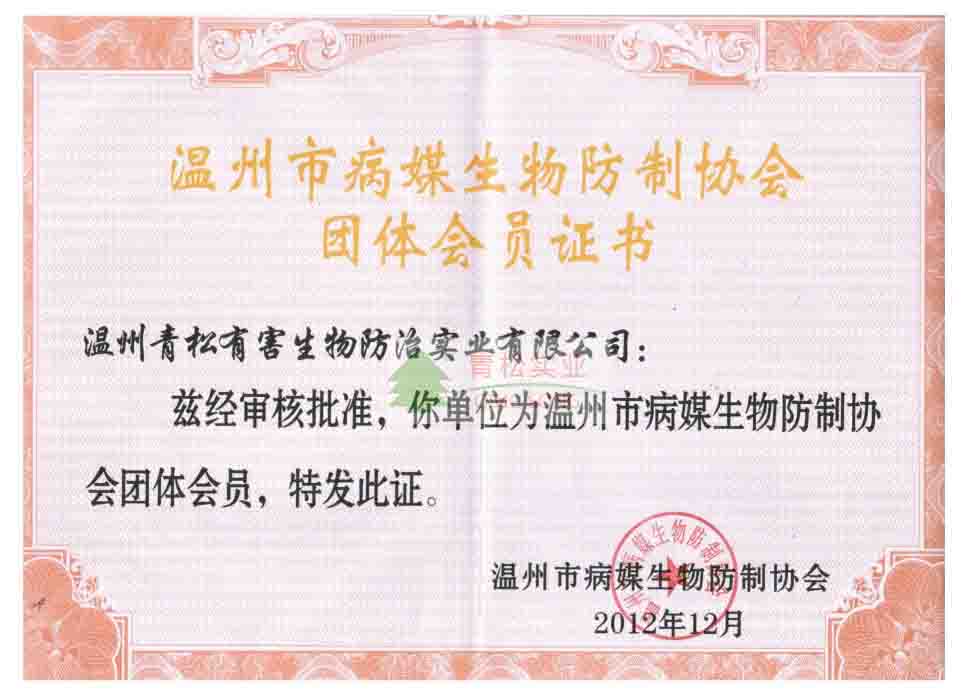 溫州市病媒生物防治協(xié)會(huì)團(tuán)體會(huì)員證書(shū)